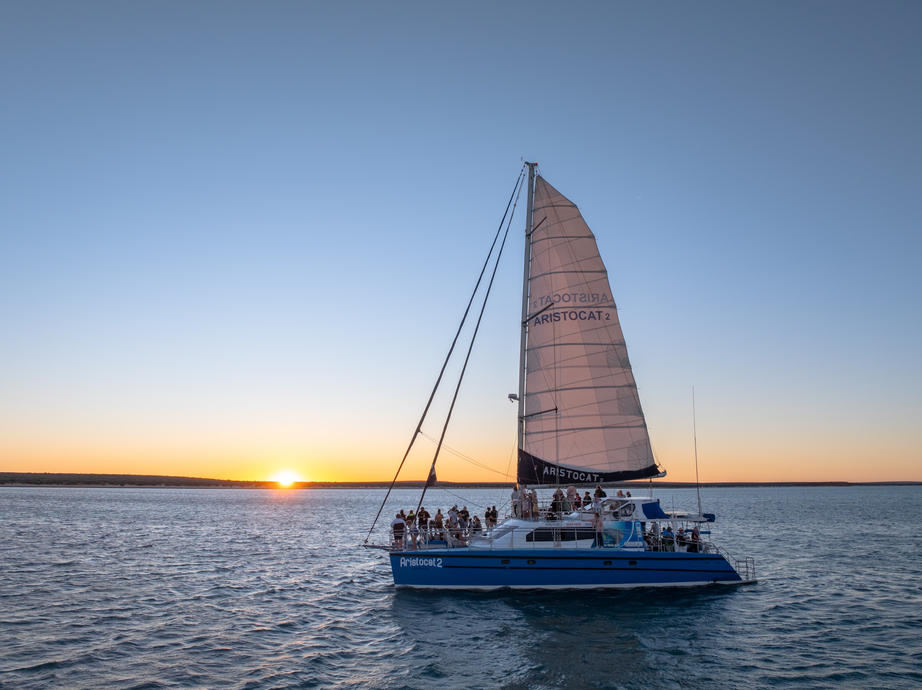 Experience the beauty of a Western Australian sunset like never before aboard our Monkey Mia Sunset Cruise. Set sail on the Aristocat 2, a luxurious 18-metre sailing catamaran, and watch the sky come alive with colour as the sun sets over the tranquil waters of Shark Bay’s Peron Peninsula.